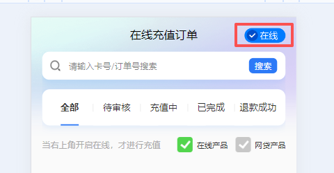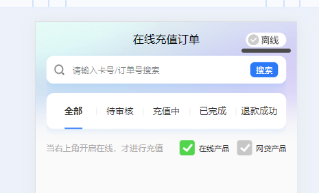 1. 在线充值订单,需要开启在线才可以进行交易。默认状态为离线状态。  2. 点击离线按钮,状态变为在线即可。再次点击即可调整为离线状态。