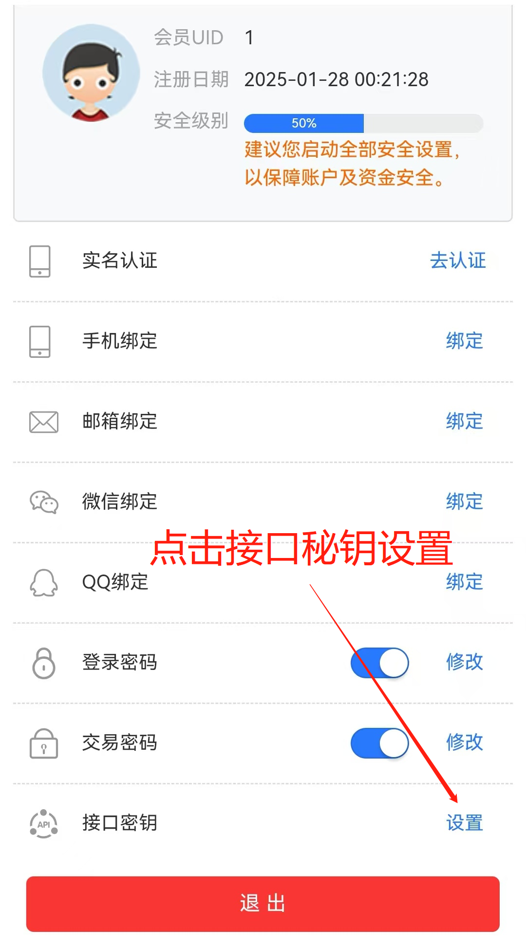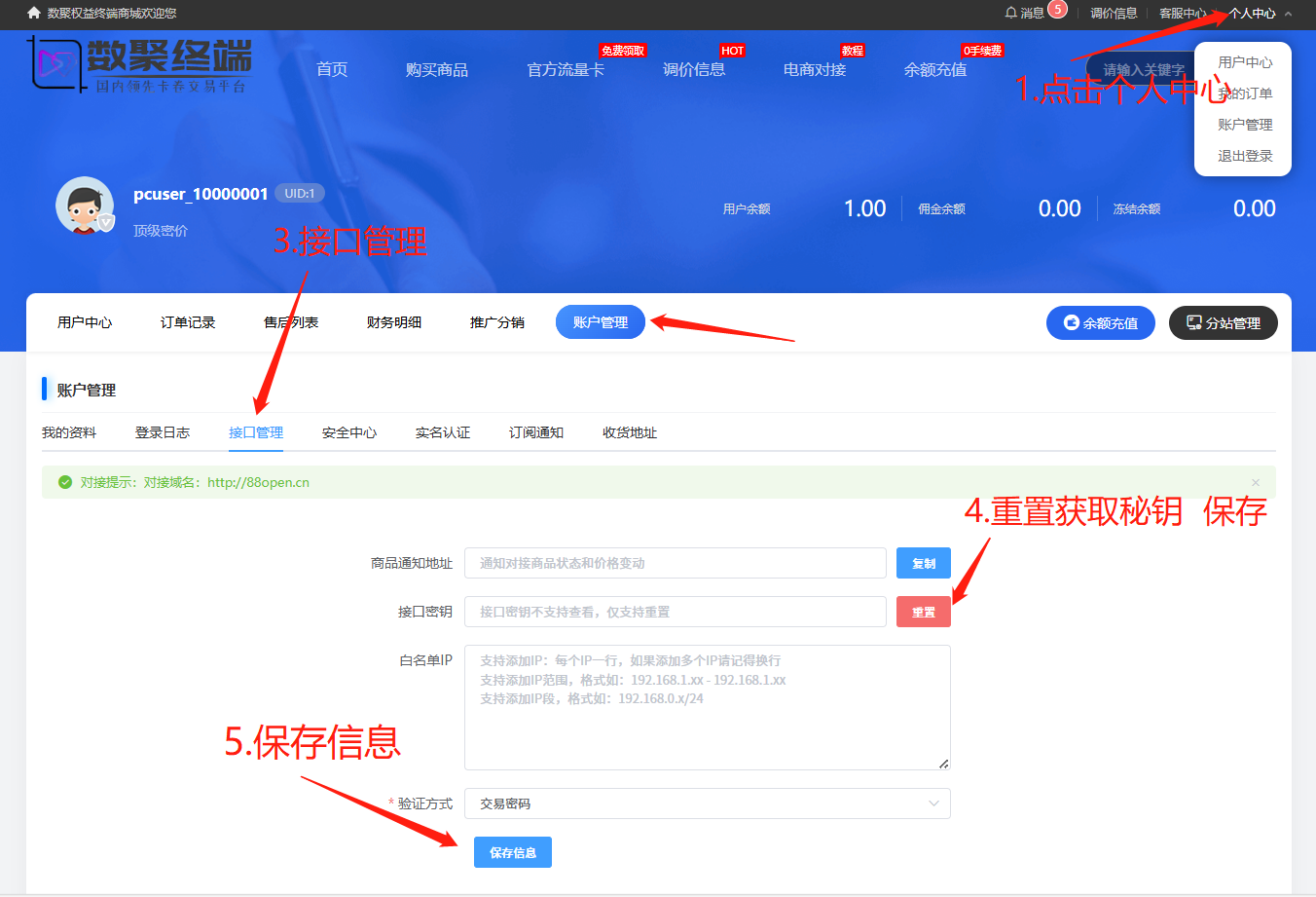 一.电脑端 1.获取流程;登录PC电脑端—个人中心—账户管理—接口管理—获取秘钥  二.手机端 1.点击我的—右上角设置按钮—点击安全设置—接口秘钥设置—点击重置秘钥