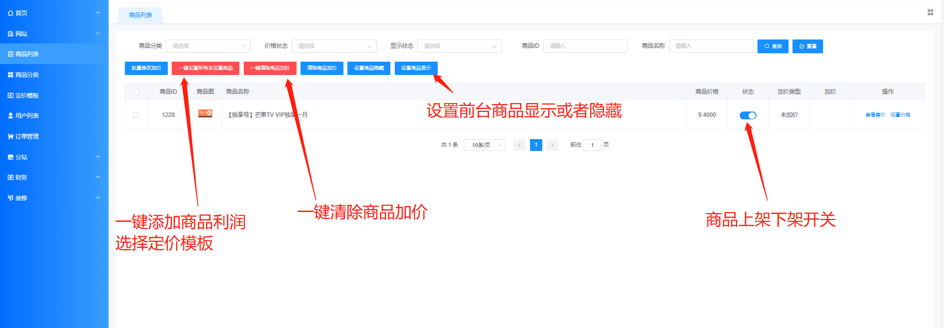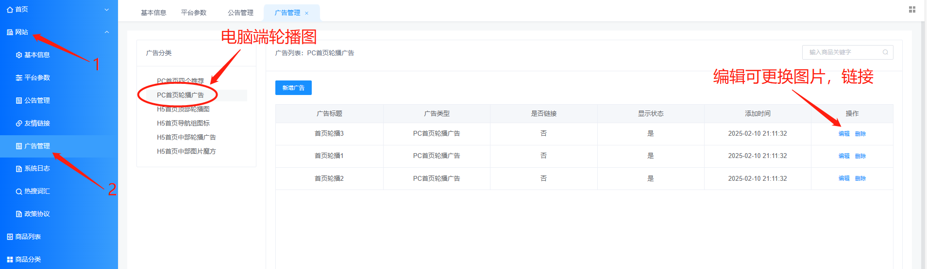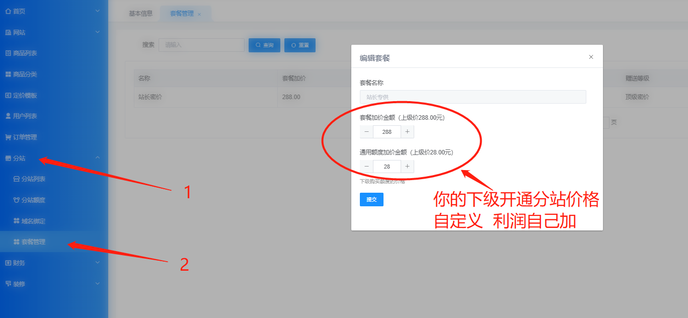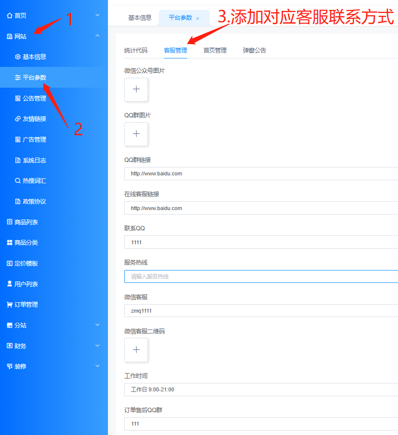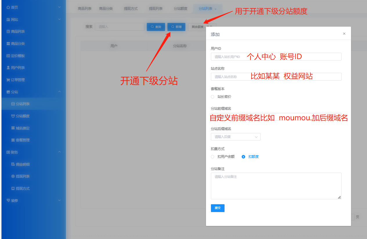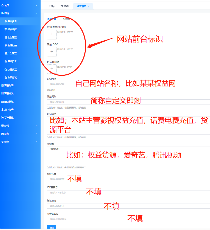 免费logo生成设计网站: https://www.logomaker.com.cn/ https://www.designevo.com/cn/ 轮播图广告模板: 模板     一.基本信息教程 1.进入分站管理   2.商品定价模版(必须设置)设置自己的利润  3.商品列表 商品管理  二.网站信息填写 1.前台信息  2.客服联系方式  3.主页轮播图广告设置 如图;   四.导航栏信息设置 如图   五.分站费用设置    六.提现设置 1、为防止套现或者洗钱等违法行动,本站提现需要强制实名认证 实名认证方法:  电脑端:点击右上角的个人中心→账号管理→实名认证 手机端:点击右下角的我的→我的资料→安全设置→实名认证 2、如需多次提现请按照以下方法操作 添加提现方式(提现方式需跟实名认证信息相同) 提现方式添加方法  电脑端:点击右上角的个人中心→用户中心→提现→添加方式 手机端:点击右下角的我的→佣金→提现→添加提现方式、 3.余额提现需把余额转换成佣金 余额转佣金方法  电脑端:点击右上角的个人中心→用户中心→提现→申请提现→提现类型选择余额转佣金→输入金额与交易密码再点确定 手机端:点击右下角的我的→佣金→提现→输入金额→提现到选择余额转佣金→立即提现 4、 提现方法 电脑端:点击右上角的个人中心→用户中心→提现→申请提现→提现类型选择支付宝→输入金额与交易密码再点确定 手机端:点击右下角的我的→佣金→提现→输入金额→提现到选择支付宝→立即提现 推广模板