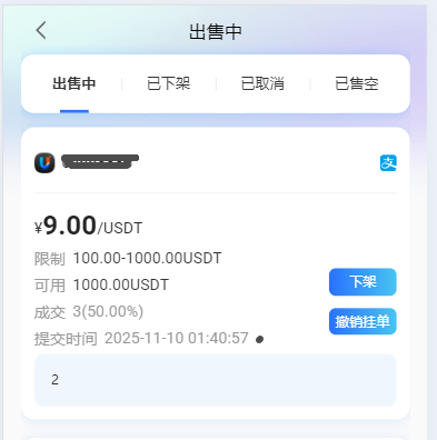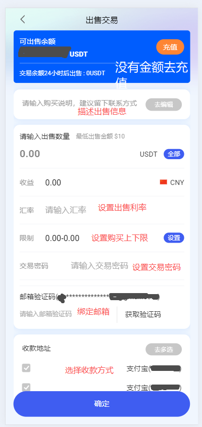 ### 如何出售USDT的流程 1\.点击首页找到常用服务,下方有一个==出售USDT,点击它==。  <br /> 2. 进入到当前页面,找到点击出售中。  <br /> 3. 进入到出售中页面,点击我要出售  <br /> 4. 进入出售交易界面  >i **USDT详细操作流程** ## USDT详细操作流程 <br /> 一. 在没有USDT的情况下面,先去充值USDT.  <br /> 二. 编辑购买说明,(可不填写)  <br /> 三. 设置出售数量  <br /> 四. 设置出售汇率(按照USD价格,或者略高一点,有会员自己填写)  <br /> 五. 设置限制(一个最低购买数量,一个最大购买数量比如:最小10\-最大100)  <br /> 六. 交易密码如果已经设置直接输入即可,如果没有去设置。 ####  <br /> 七. 输入邮箱验证码。  <br /> 八. 选择收款方式。(如果没有收款方式,请填写正确收款方式,==支持多种收款方式。==)   <br /> 九. 确认信息无误,点击最下面确定按钮即可。  <br /> 十. 订单展示在出售中页面,可以下架,可以撤单